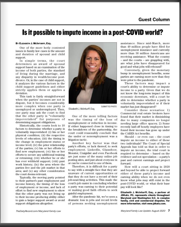 Last week, Attorney Elizabeth J. McInturff of JDKatz, P.C. had her article regarding imputing income in a post-COVID-19 world featured in The Daily Record. To read the article, simply click the image below.