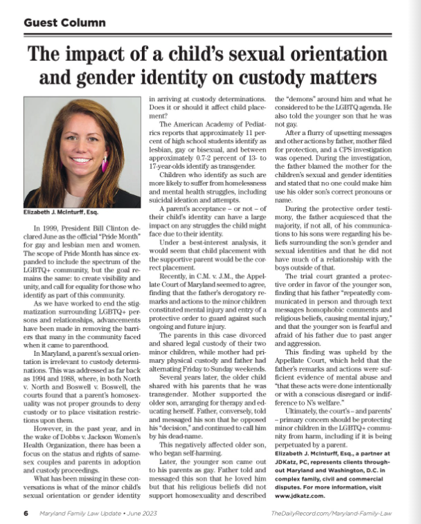 Elizabeth J. McInturff, Esq., of JDKatz, P.C., recently wrote a guest column in The Daily Record. She explains how the state of Maryland deems a parent’s sexual orientation irrelevant when making adoption and custody determinations. Though, there is still the question of how a minor child’s sexual orientation or gender identity may play a role in these proceedings. Elizabeth remarks that the court’s and parents’ primary concern should be protecting their child from harm, including if it is being perpetuated by a parent. To learn more about this, click on the picture below.